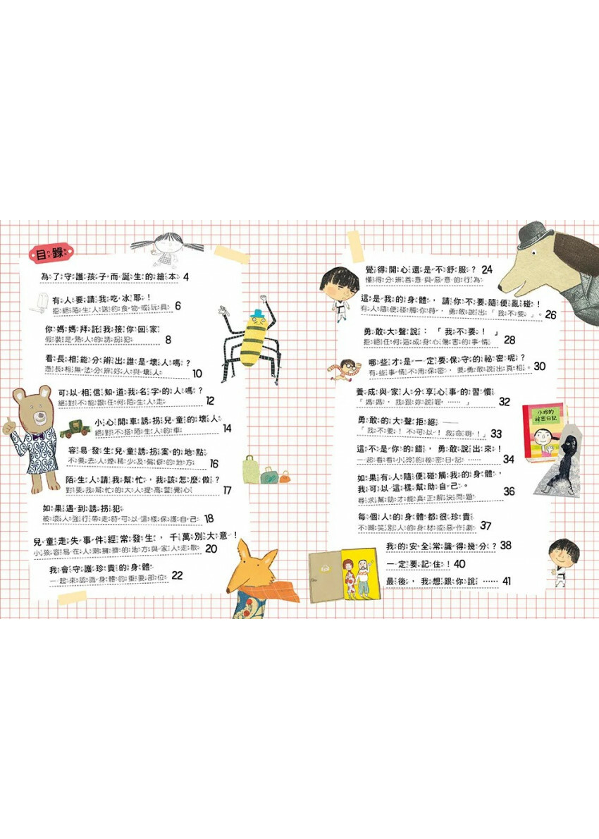 不論孩子現在幾歲,都要和他一起閱讀這本安全繪本,書中模擬了各種可能被壞人騷擾或誘拐的場合及情境,並告訴孩子正確的應對方式,以及遇到有人要隨便觸碰你時,要大聲說出「我不要」!