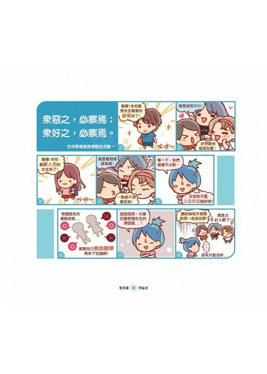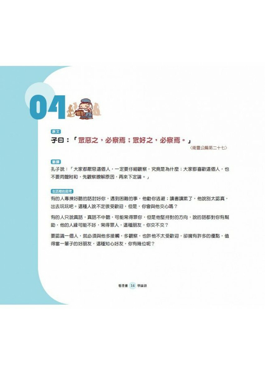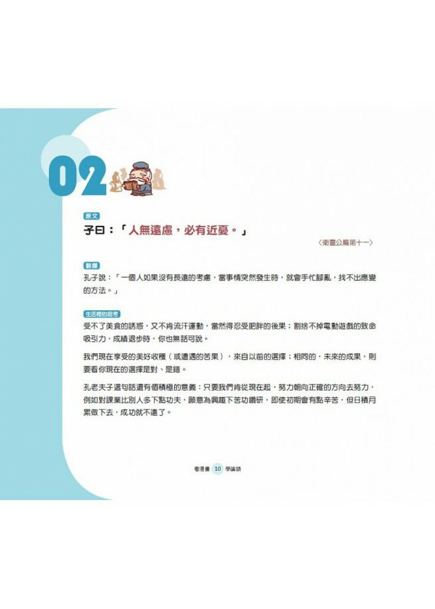 每篇都有《論語》原文和翻譯,加上「生活裡的思考」,以及獨特且生動活潑的漫畫解析,讓讀者能「學而時習之,不亦說乎」!