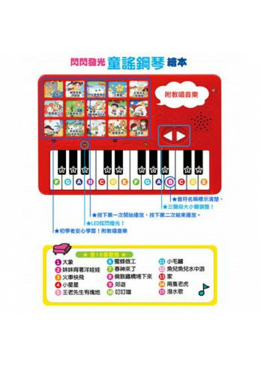 趣味童謠繪本與小鋼琴一體成型的獨特設計,隨時彈奏動人音樂、享受美好旋律,讓寶貝走到哪彈到哪。