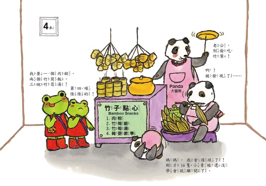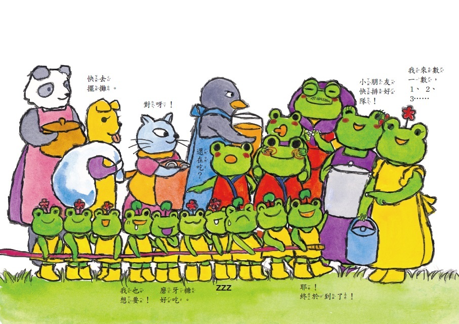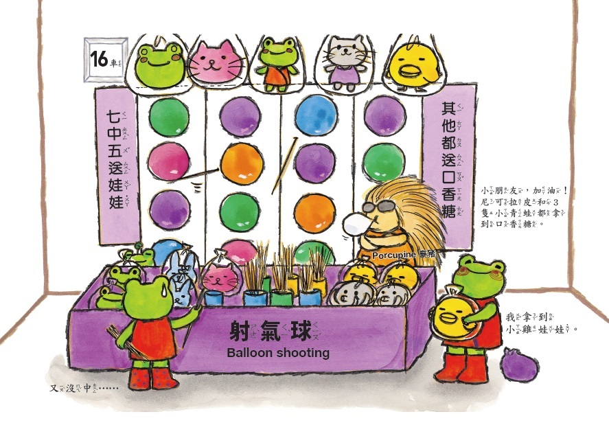 2.幽默感:小狗賣的熱狗是狗肉做的嗎?愛推糞的糞金龜推的圓滾滾地瓜球你敢吃嗎?企鵝賣的霜淇淋竟然是花枝口味?……最天馬行空的想像,最童心可愛的發問,跟著愛吃&愛發問的青蛙兄弟一起去逛園遊會吧!