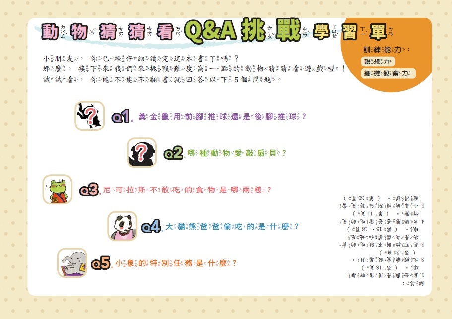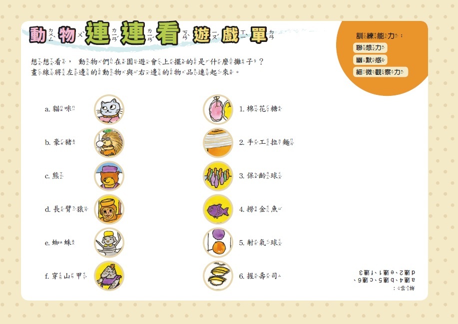 3.聯想力:想想看,如果是貓咪會擺什麼攤子?大貓熊呢?穿山甲呢?青蛙呢?不同動物的生態習性,擺出不同的園遊會攤子,激發孩子聯想力的同時,也能增加孩子的生物知識。