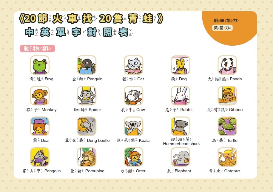 5.英語力:20種動物及園遊會遊戲、食物中英對照,孩子讀繪本的同時也能提升英文能力。