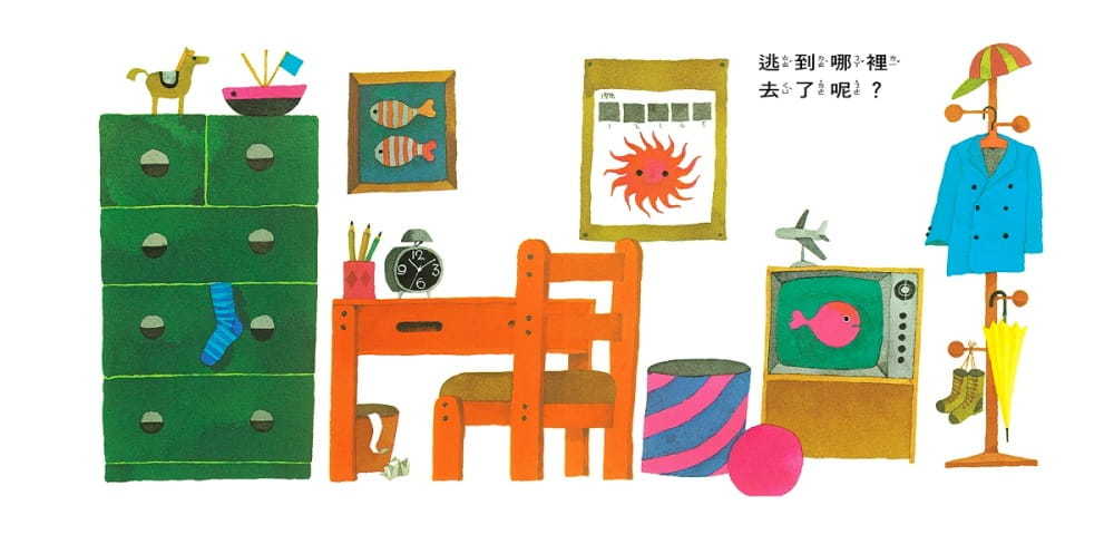 小金魚逃走了,跑到哪裡去了呢?小金魚竟然躲到窗簾的圖案中,躲在糖果罐、玩具堆裡;更妙的是小金魚躲到鏡子裡去了,經過鏡子的反射,到底哪一隻才是真正的小金魚呢?
