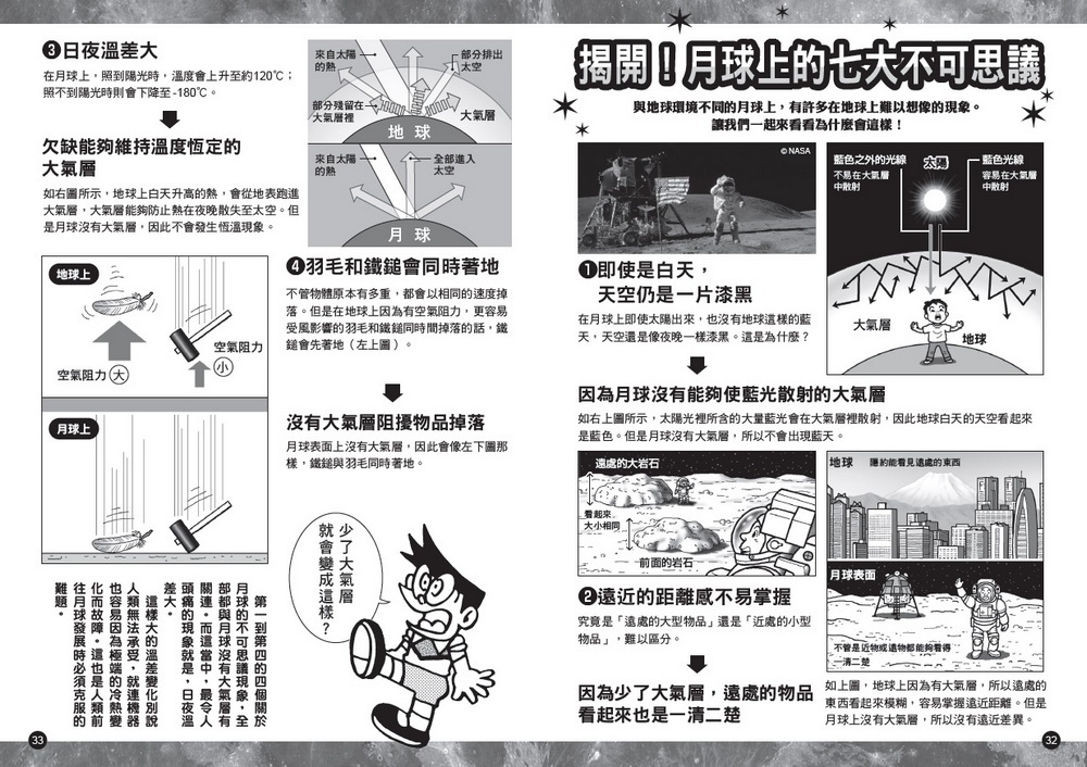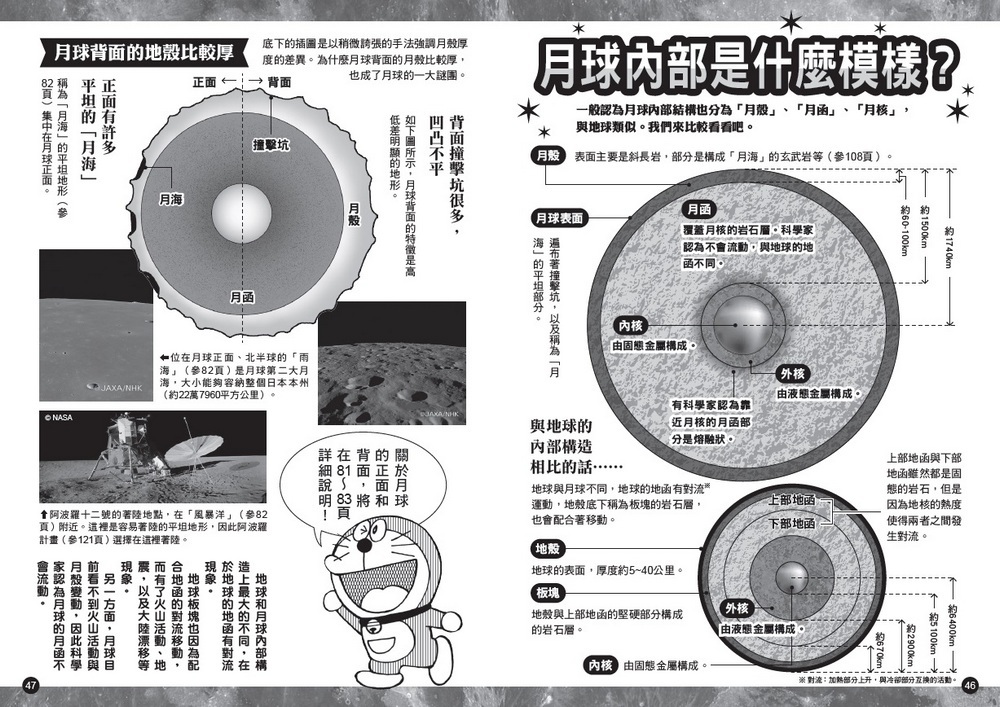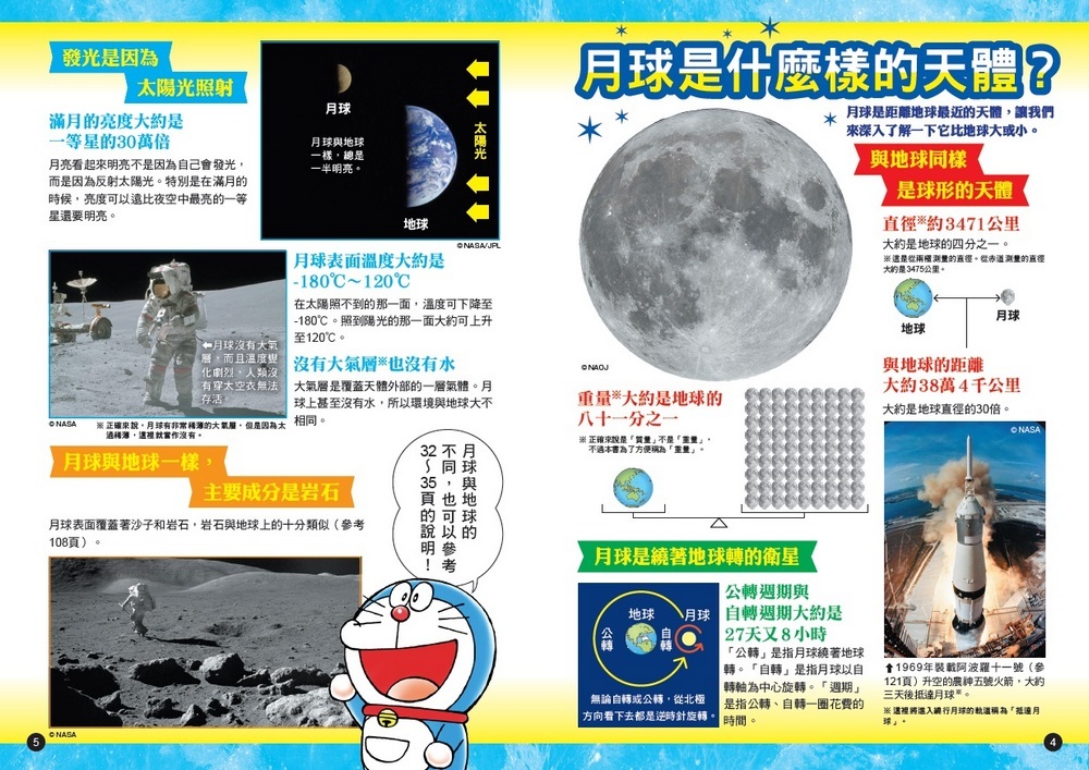 跟著新任自然老師──哆啦A夢,一起搭乘勘查號前進月球,你一定可以藉此吸收到許多有趣的月球奇妙知識唷呵!!