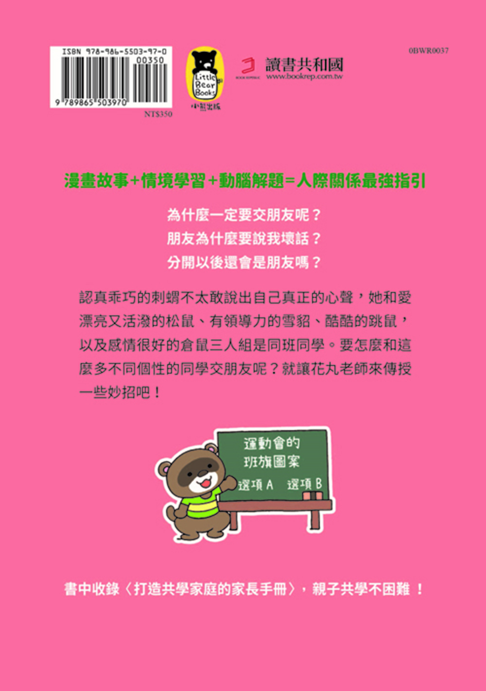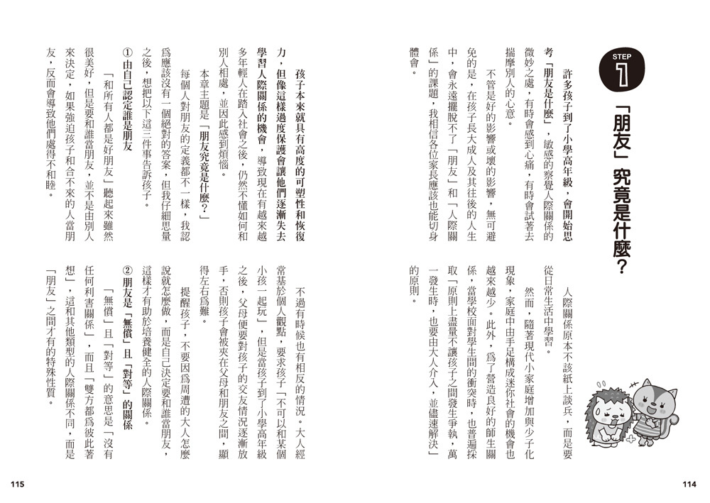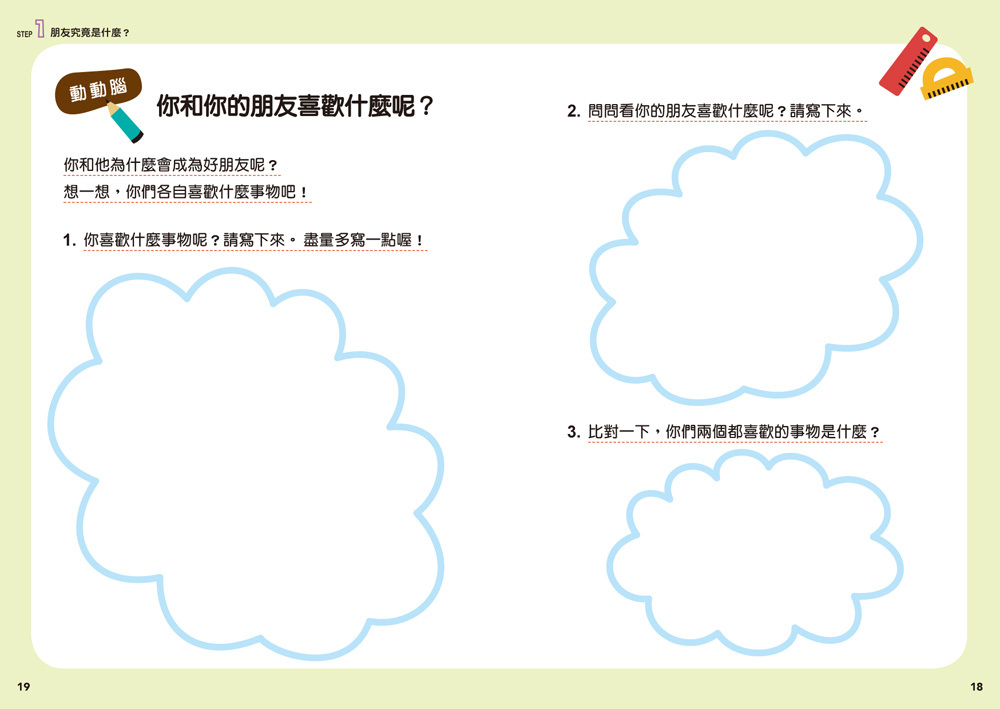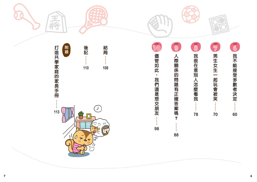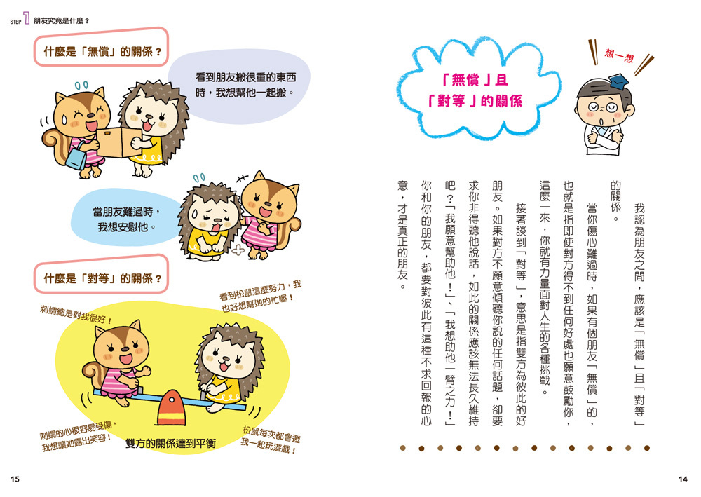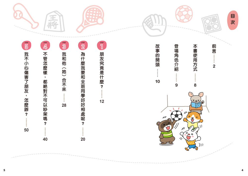 每個章節的最後,更精心設計幫助孩子理解如何經營人際關係的遊戲或題目,讓孩子在動腦解題的同時,應用人際關係經營的方法。