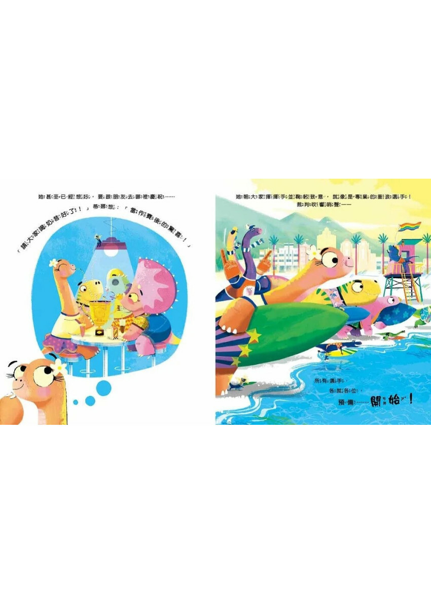故事裡的主角恐龍蒂娜,是恐龍城中能歌善舞的風雲人物,某天,城裡傳來了衝浪比賽的消息。多才多藝的蒂娜信心滿滿,覺得自己肯定一下就上手,便和其他人一樣躍躍欲試,準備在比賽中大顯身手。