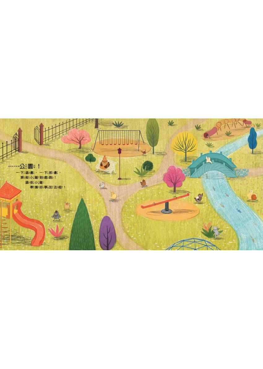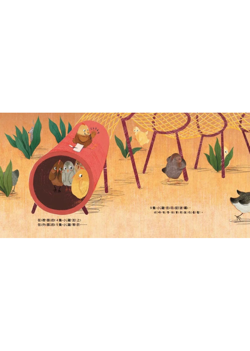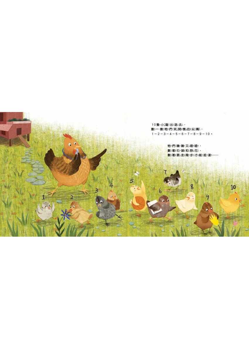 一起翻開書頁,帶著孩子跟10隻小雞來去公園玩耍,進行趣味的數學遊戲吧!