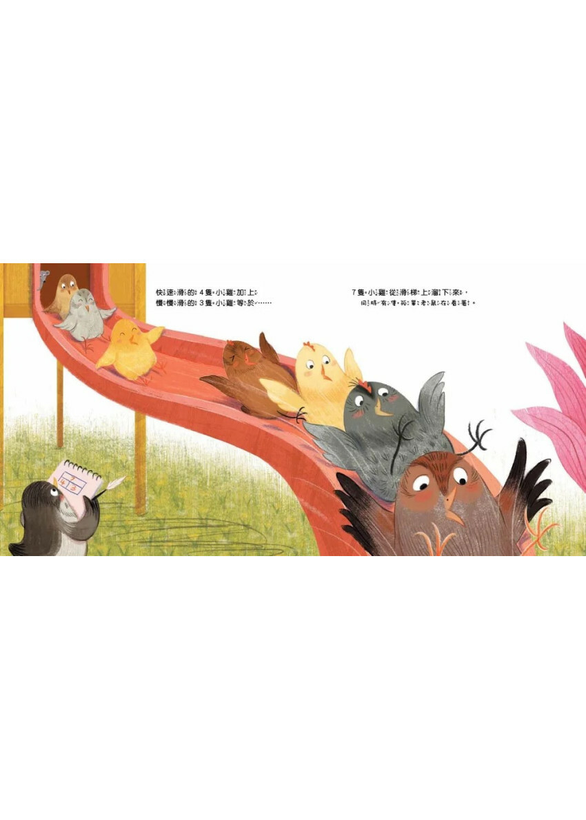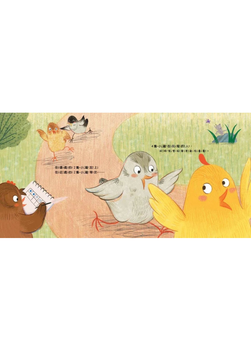 主角是10隻熱愛數學的小雞,在《10隻小雞在公園》這一個故事裡,當小讀者們一頁一頁地跟隨著小雞滑下滑梯、在鞦韆上盪鞦韆和玩捉迷藏,感受到樂趣的同時,也跟著小雞們一起練習了各種加法計數技巧。