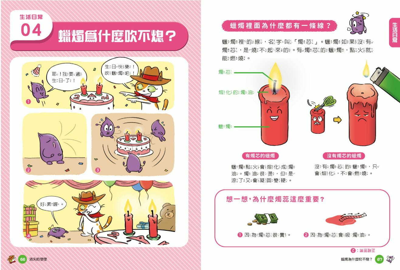 以漫畫勾勒生活中的真實情境,挑起孩子大大的好奇心,進而引發疑問、帶出科學問題。