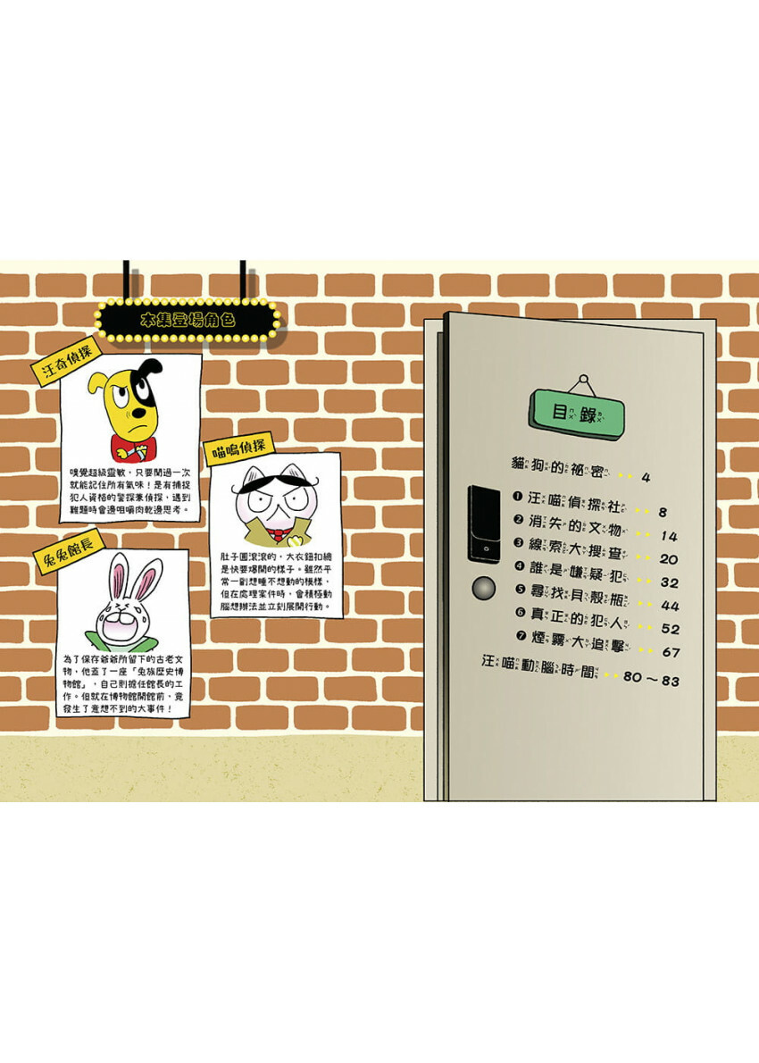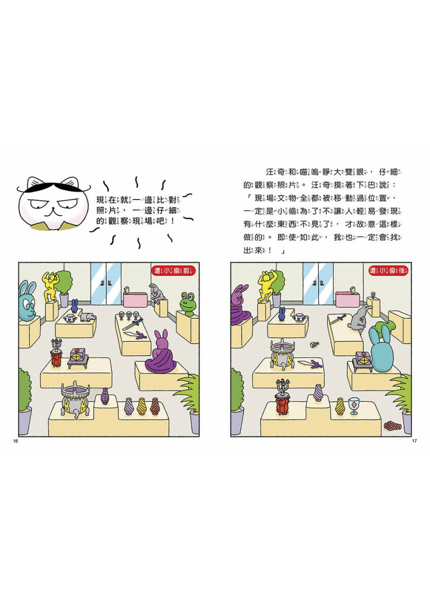 「一定要找出犯人!」喵嗚偵探和汪奇偵探立刻出動,前往兔族歷史博物館尋找線索,經過仔細的搜查和科學分析,他們發現了「可疑的動物們」!究竟,竊取文物的博物館小偷是誰?請你跟著汪喵偵探一起尋找線索,解開案件謎團吧!