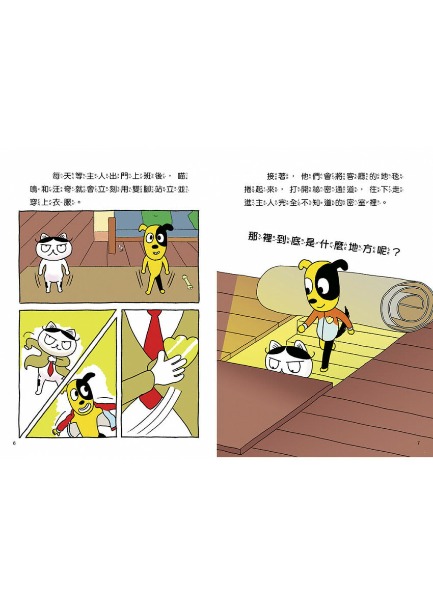 只要主人不在家,小狗汪奇和貓咪喵嗚就會立刻變身為偵探,在他們的祕密基地──汪喵偵探社裡做運動、吃早餐,接著等待新的偵察任務。他們目前總共偵查了498個案件,解決了496件,只剩 2 件尚未破案……今天會發生什麼難解的案件呢?