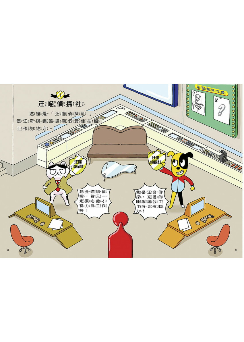 韓國書籍網站五顆星評鑑,小讀者都一致好評的貓狗偵探故事!目前全套五冊,與韓國同步,陸續出版。精采的情節內容、各具特色的逗趣主角、身歷其境的偵探遊戲,保證翻開第一頁後就停不下來,忍不住一路跟著汪喵偵探追查案件真相。