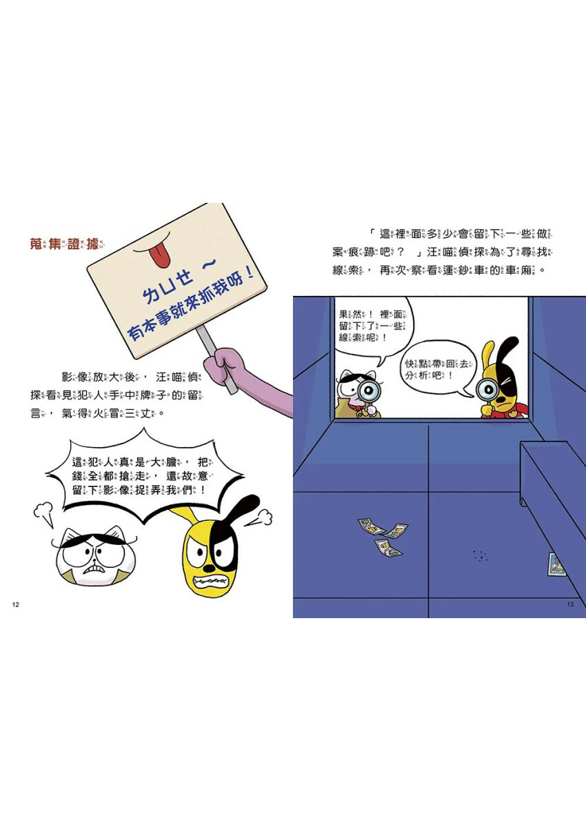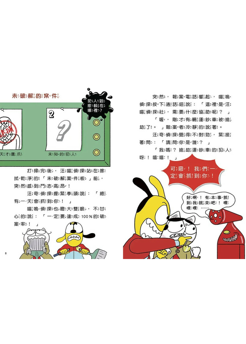 雖然順利逮捕犯人,但汪喵偵探越想越不對勁,因為這次的搜查是有史以來最順利的一次,實在是太令人感到不安啦!難道真正的犯人被刻意隱藏了嗎?汪喵偵探能找出更多線索,不讓壞蛋的詭計得逞嗎?現在就翻開書本,找出可疑之處,跟著汪喵偵探一起破解案件吧!