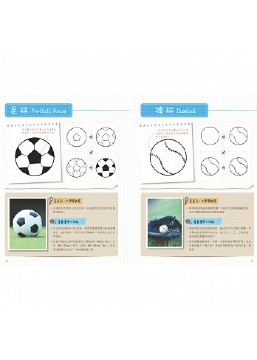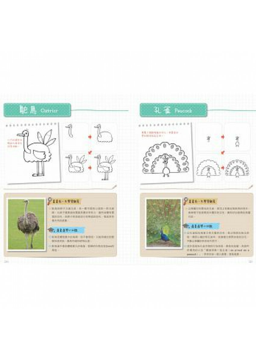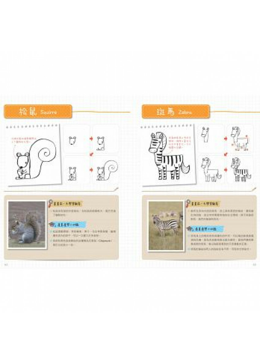 與身體、老鼠的頭像是三角形等等,本書收錄的122種圖案,都有說明觀察重點與小知識,讓孩子在畫畫的過程中,培養敏銳的觀察力並增廣見聞。