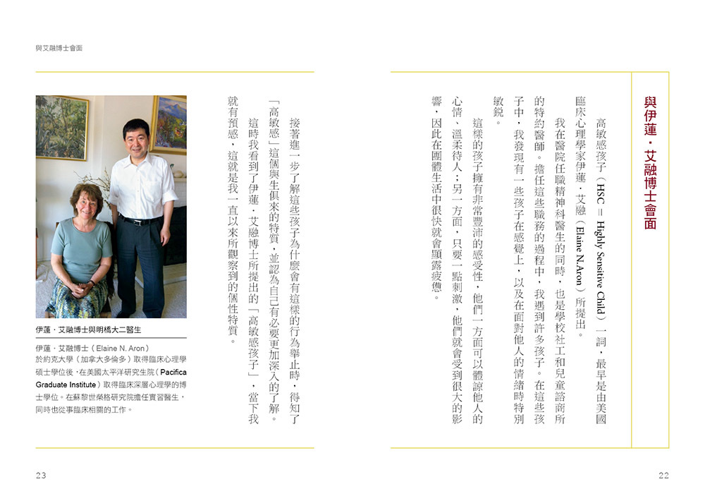 「高敏感孩子 HSC=Highly Sensitive Child」一詞最早是由美國臨床心理學家伊蓮.艾融博士提出,為了讓更多人進一步理解這類型孩子的特質,作者明橋大二特別與艾融博士會面並撰寫本書,希望父母們能更深入了解高敏感孩子,讓孩子和父母都能幸福生活。