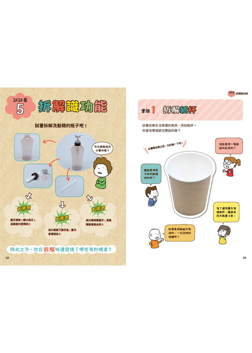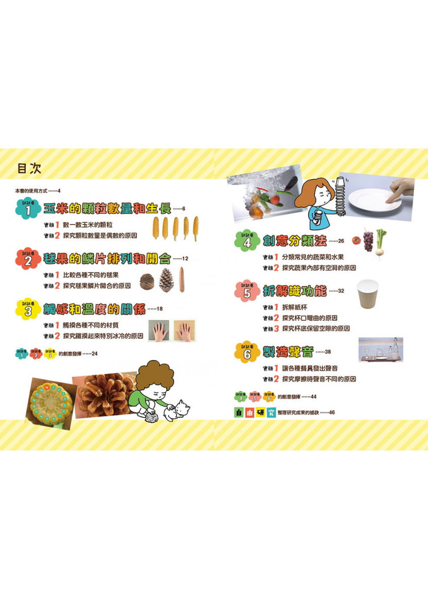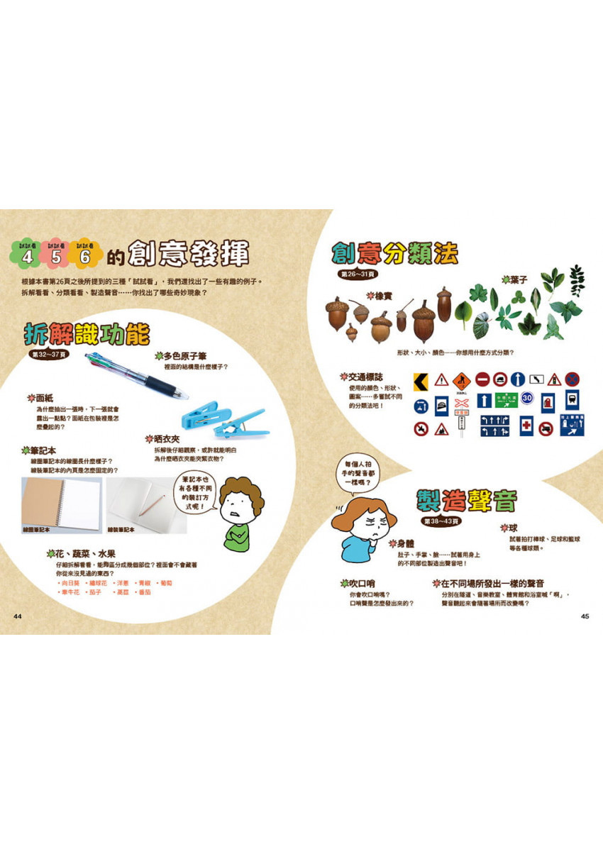 完成充滿奇想的「試試看」之後意猶未盡,本書的「創意發揮」單元提供更多舉例,包括:數一數各種書本頁數歸納出是否有規則、比較柑橘類水果特徵的異同、摸摸廚房中都是白色粉末狀的調味料、挑戰以顏色或形狀來分類常見的交通標誌、拆解多色原子筆研究構造和功能,以及試著在浴室和體育館喊「啊」,探究聲音聽起來不一樣的原因,給予孩子更多激盪靈感的點子。