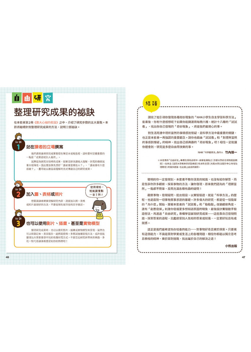 隨著科學方法的逐步培養,如何將研究成果整理成讀者也能理解的報告,並且進行發表,更是不可或缺的環節,本書「自由研究」專欄是整理研究成果的祕訣,從撰寫角度必須站在讀者立場、報告中增加圖表和照片,以及使用實驗模型輔助說明等,都是成果發表應注意的重點。