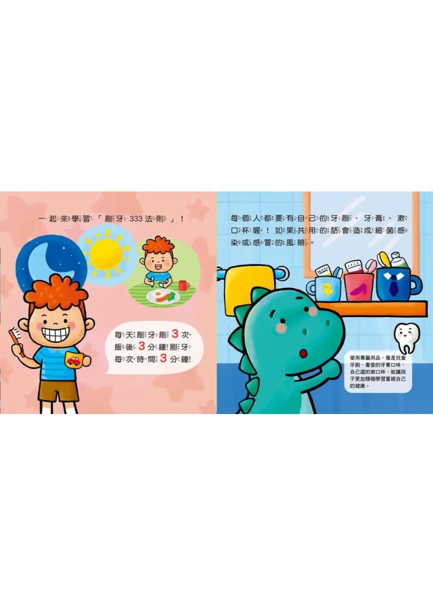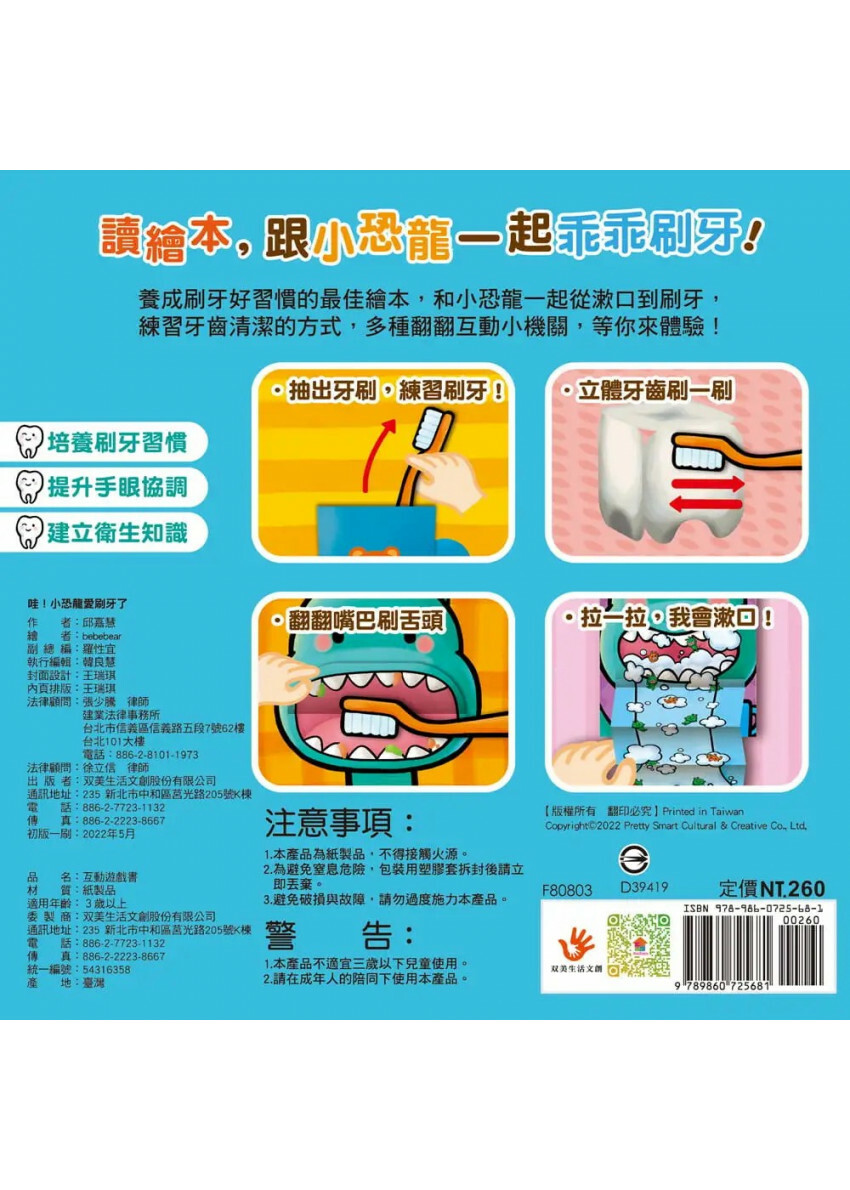 而在觀察書中小恐龍和小朋友刷牙的過程中,搭配多種驚喜小機關,不僅讓閱讀變得更有趣,也能激發孩子主動學習刷牙知識的渴望,從擠牙膏的大小、手握牙刷的方式、刷牙的步驟與技巧、衛教知識等。您的寶貝還不會乖乖刷牙嗎?現在就來讀繪本,跟著小恐龍乖乖刷牙!