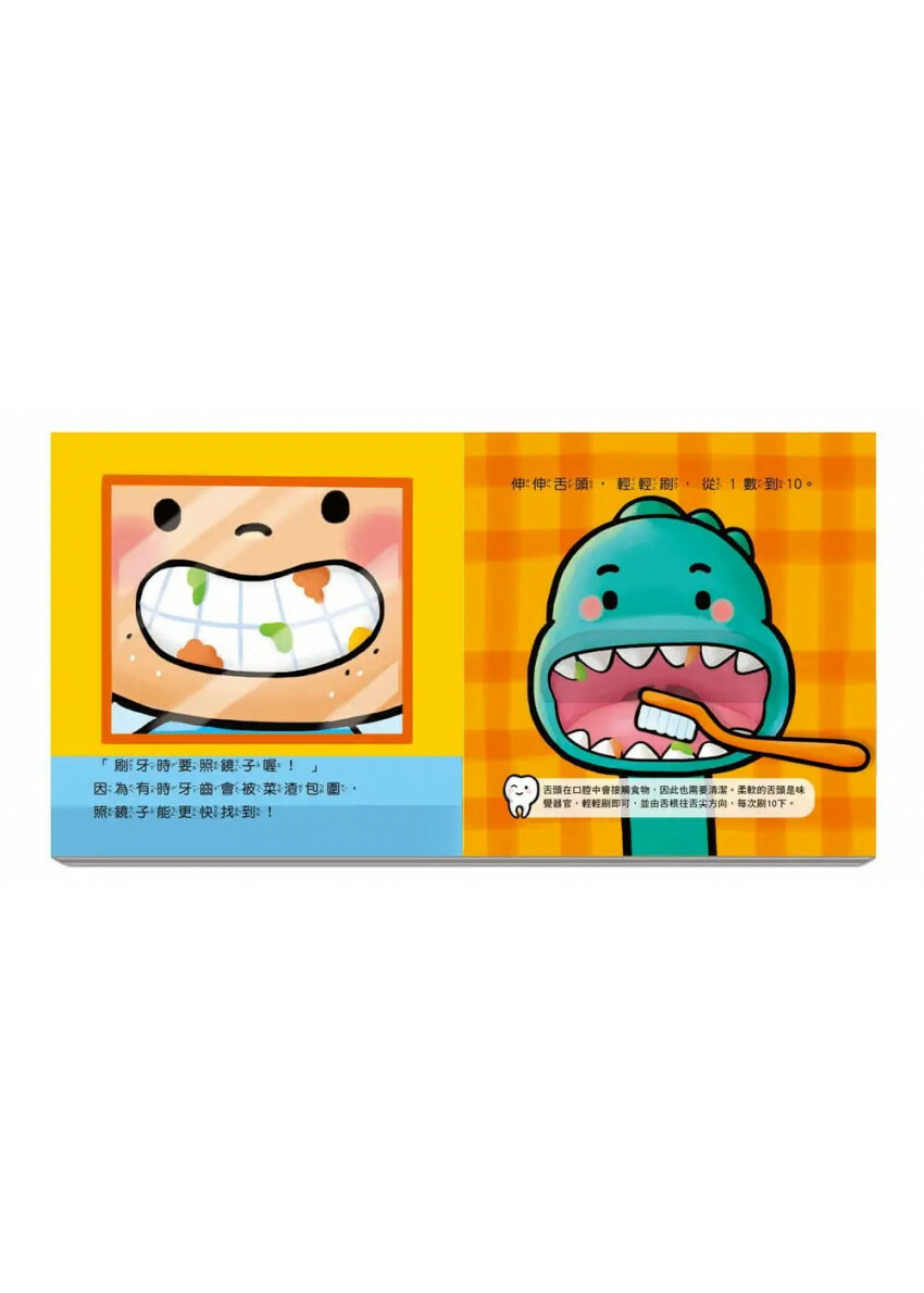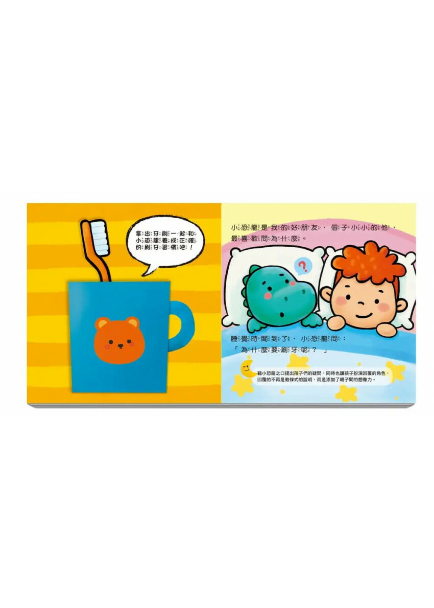 這些話像不像家中小寶貝平常會說的話呢?充滿想像力的故事情節,藉小恐龍之口提出孩子們的疑問,同時也讓孩子扮演回覆的角色,回覆不再是教條式的說明,而是添加了親子間的想像力!搭配明亮可愛的畫風,增加孩子對刷牙的興趣,建立滿滿的趣味感與養成好習慣!
