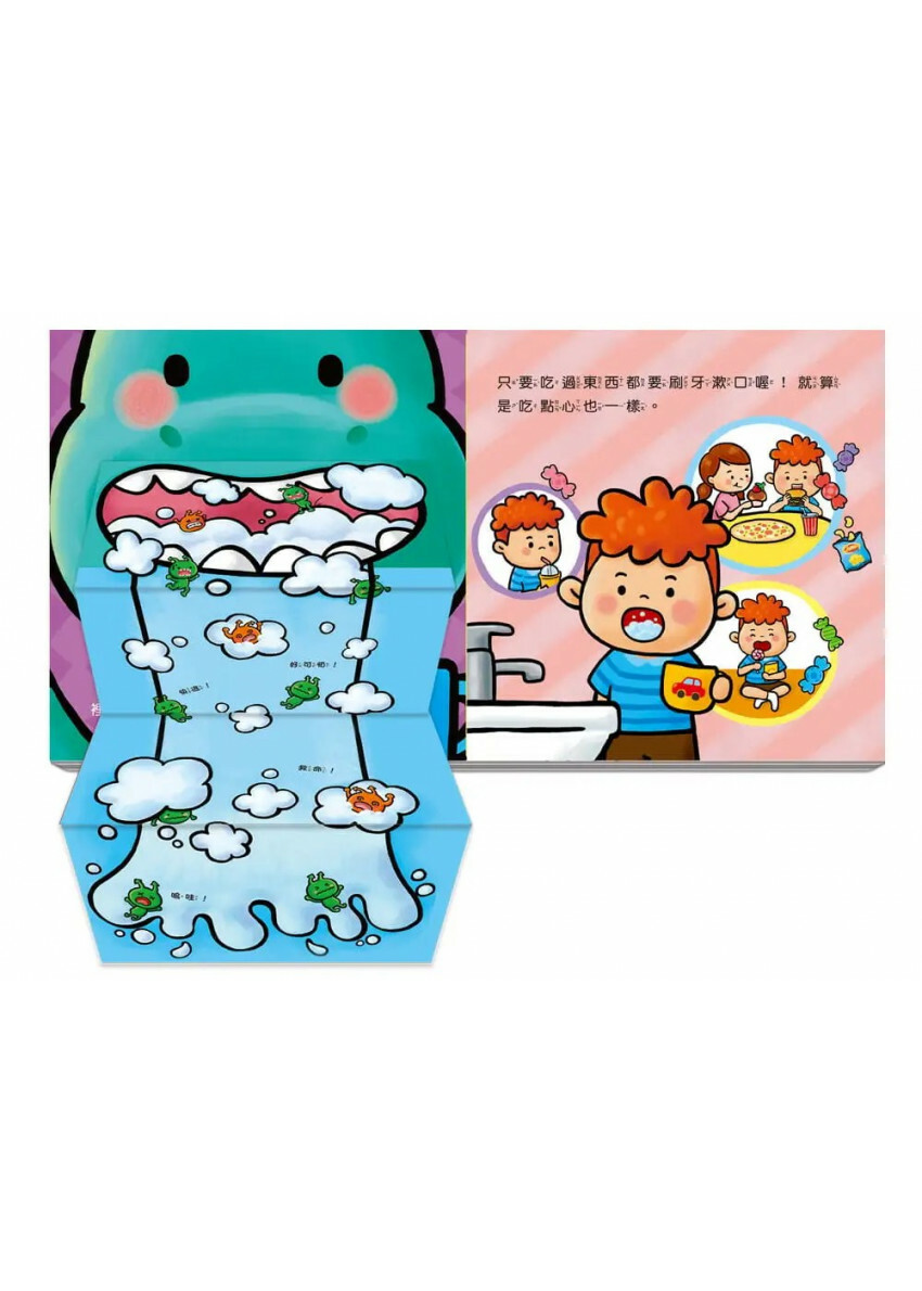 4.多種互動機關吸引孩子動手操作。(抽出牙刷、刷刷立體牙齒、拉下漱口拉頁、翻開嘴巴……等。)