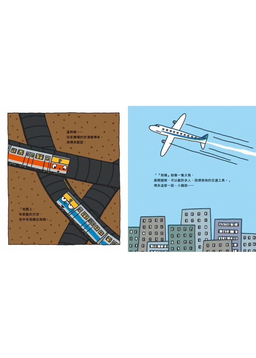第一次上路的小鐵,對於又黑又窄的隧道感到害怕又無聊,讓他忍不住對地上的世界感到好奇,各個地鐵「前輩」們繪聲繪影的向小鐵描述地面上的景象,有「大盒子」、「可以載人的大鳥」、「大火球」……..這些畫面在小鐵的腦袋究竟成了什麼景象?聽完大家的敘述後,小鐵還是想到地面上一探究竟嗎?再次出擊的宮西達也,這次帶領大小讀者在「真實世界」及「想像世界」來回穿梭,獨特的「宮式幽默」令人不禁會心一笑!書中的地上世界有著我們最熟悉的景點,在這疫情時代就讓乘著想像的翅膀,和孩子來場小旅行吧!
