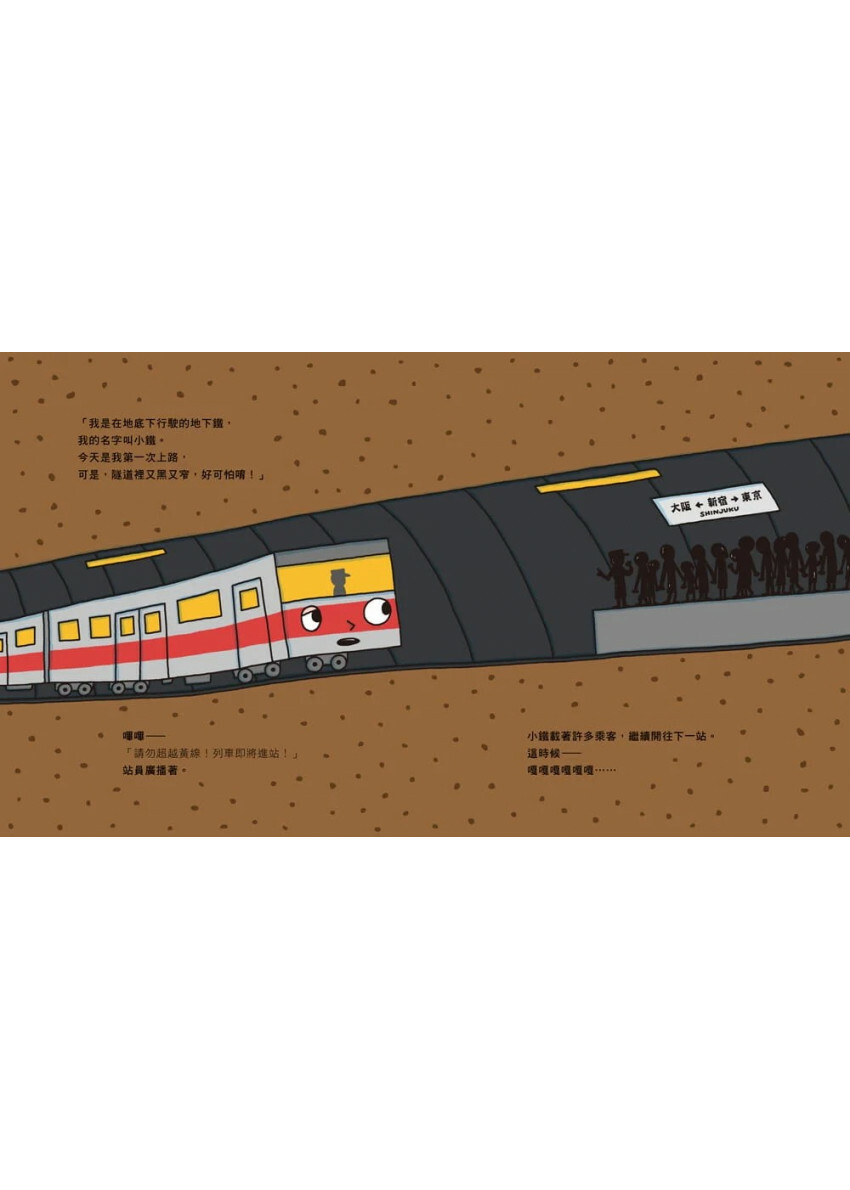 第一次出任務的地下鐵小子小鐵,來到又黑又窄的隧道,覺得好可怕!但是小鐵克服恐懼努力工作,即使遇到突發的狀況,也擦乾淚水勇敢前進。這就像在描寫小朋友的心境,輕巧地帶出孩子初到陌生環境,內心害怕的感覺。接著小鐵認識了許多地鐵好朋友,各司其職的小地鐵們,經過大城市、機場、動物園……這些大家熟悉的場景,在小鐵的腦海中竟組成奇妙的畫面,令人捧腹大笑!