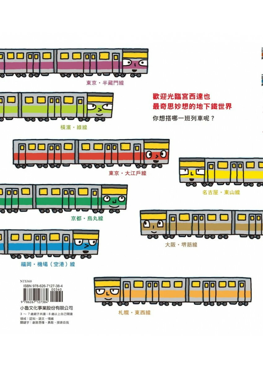 看宮西達也的《地下鐵小子》,讓即使沒有搭過日本地鐵的臺灣朋友們,通過辨識不同路線的各種車體色條,輕鬆認識在地底複雜交錯卻清楚分明的地下鐵路線。有趣的是,本書透過將地下鐵擬人化的方式,呈現不同地下鐵路線沿途的景觀、地方差異,還能跟著主角「小鐵」一起想像未曾見過的事物,打破讀者們對生活世界中的既定認知印象,天馬行空地創造出嶄新的風景與生物,讓讀者們能跟小鐵一齊面對經歷未知時的恐懼,找到通過黑暗的勇氣。