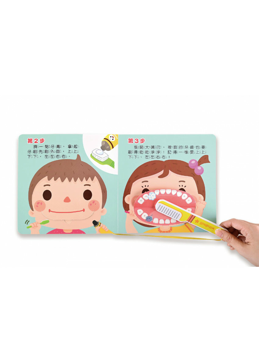 每一頁的翻翻內容搭配仿真牙刷配合刷牙,最後還有鏡子整理儀容,使孩子在閱讀過程中能身歷其中,學會自己刷牙後也不容易遺忘,養成整潔自律的動作記憶。