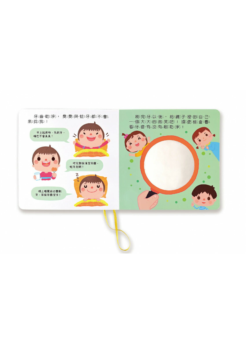 3. 貼心鏡面設計──書末附加貼心鏡子設計內頁,可讓孩子在刷完牙後照照鏡子,看看牙齒有沒有刷乾淨,養成儀容整潔自律行為。