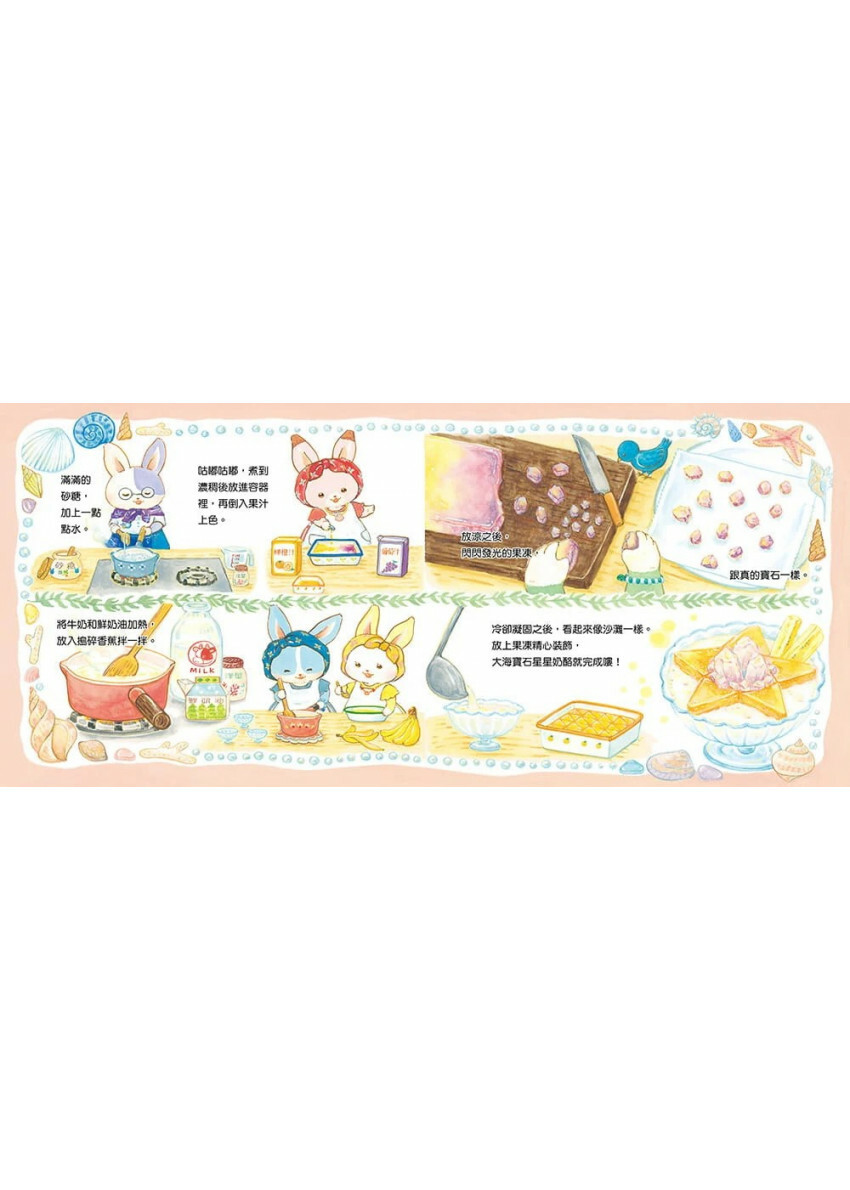我和孩子按照繪本裡的食譜做了「大海寶石星星奶酪」,寶石果凍看起來像真正的寶石一樣閃耀!孩子們真的很喜歡小兔子的料理,這個系列結合了繪本和食譜,是一本讓人打從心底愛上的作品!──芸芸(喜愛和孩子動手做的媽媽)