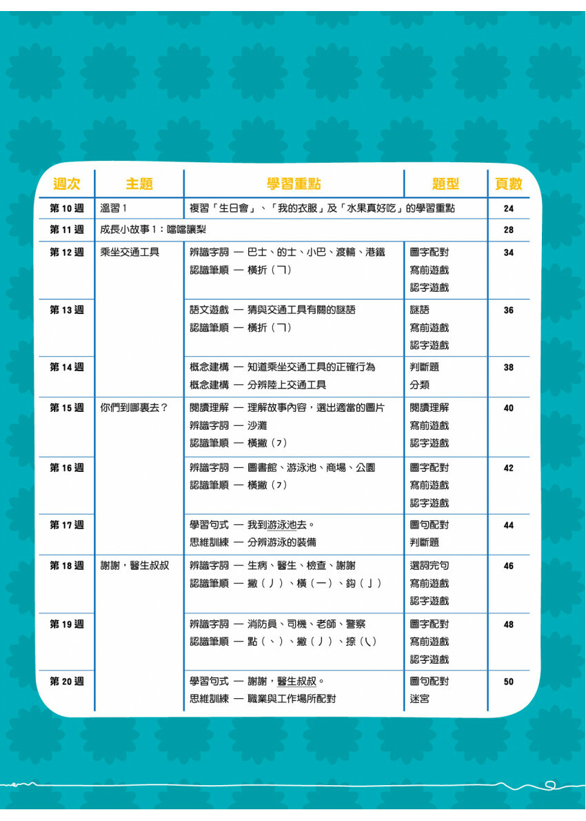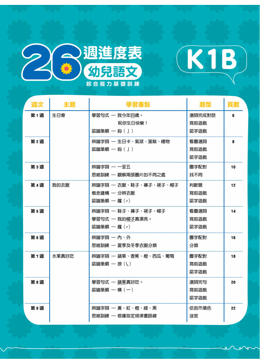 26週內容按主題編排,清楚標示學習重點和活動,為幼兒提供循序漸進的語文基礎訓練