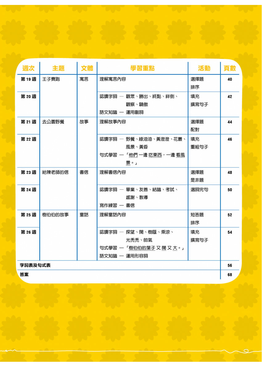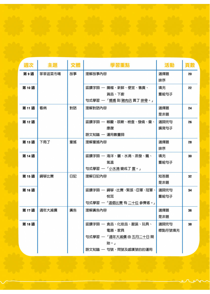 內容包括不同文體,包括故事、日記、童謠、海報及通告等閱讀理解篇章
