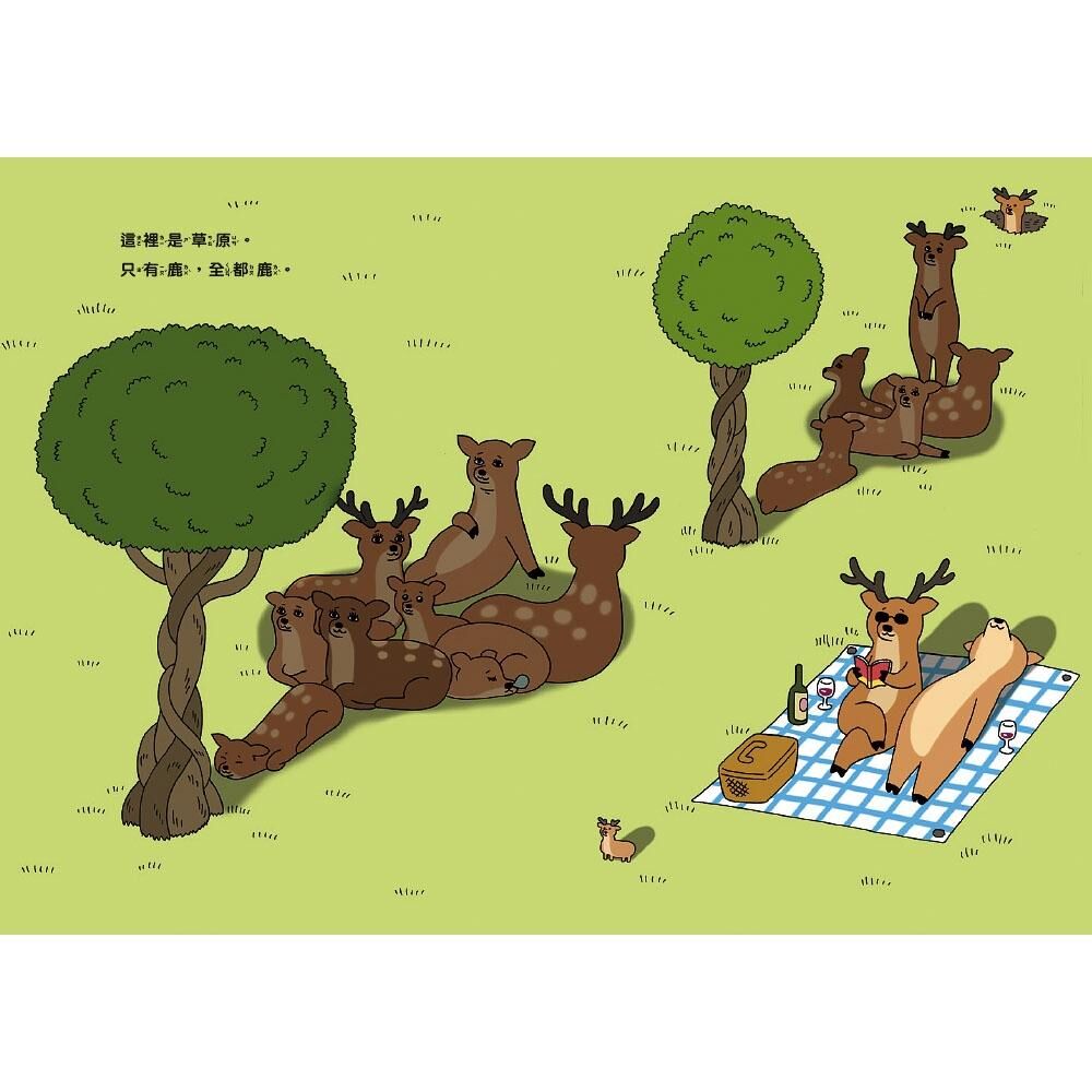每一頁都是鹿、鹿、還是鹿。因為奈良公園的鹿都很溫馴,我從沒覺得鹿可怕,但如果像這本書這樣,鹿多到這個程度,好像真的會讓人忍不住發出「喔唷」的驚呼。牠們用兩隻腳走路也一點都不奇怪,反而覺得好好笑。翻頁的時候嘴角失守,讀完之後卻又一下子恢復平靜——就是這麼一本讓人瞬間切換表情的有趣繪本