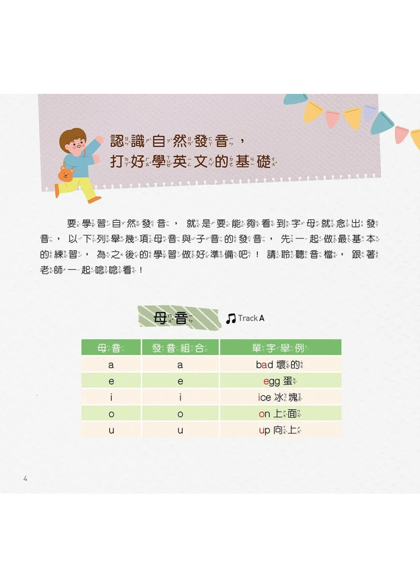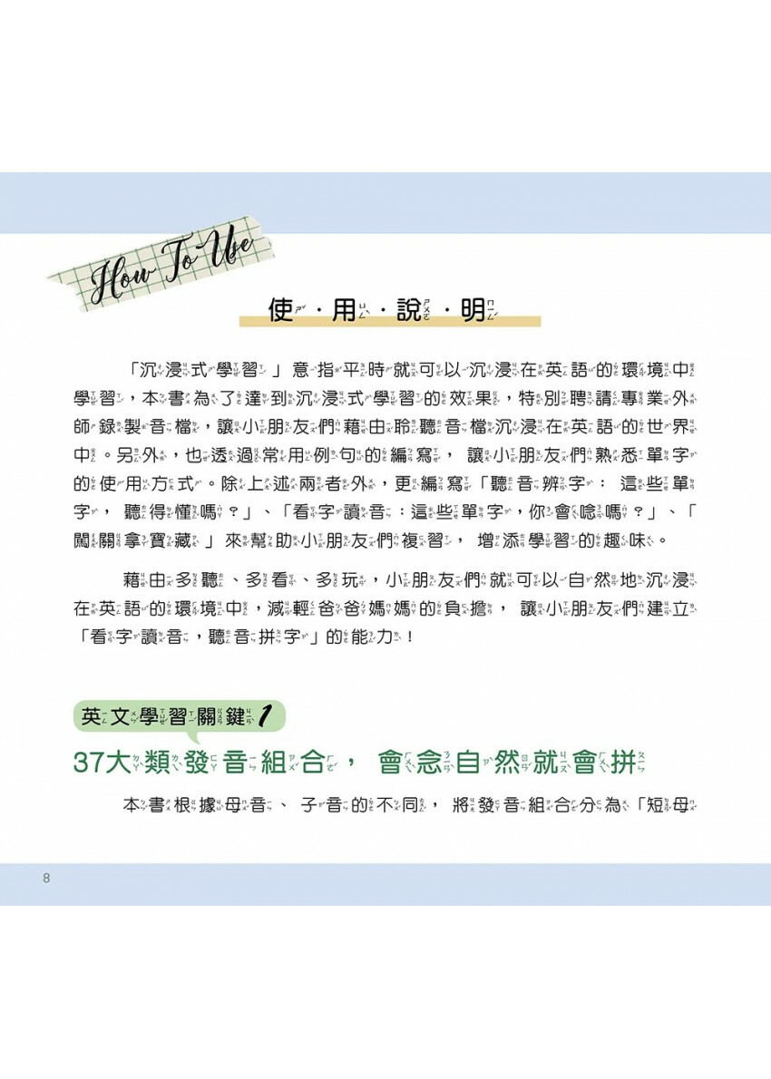 爸爸媽媽擔心沒空可以帶小孩嗎?沒關係!本書附上專業外師錄製的音檔,語速適中、咬字清晰,相當適合剛初學英文的小朋友,也貼心附上每個字的注音,孩子自己就能讀得懂!讓孩子跟著老師一起唸發音與單字,自然而然學英文!