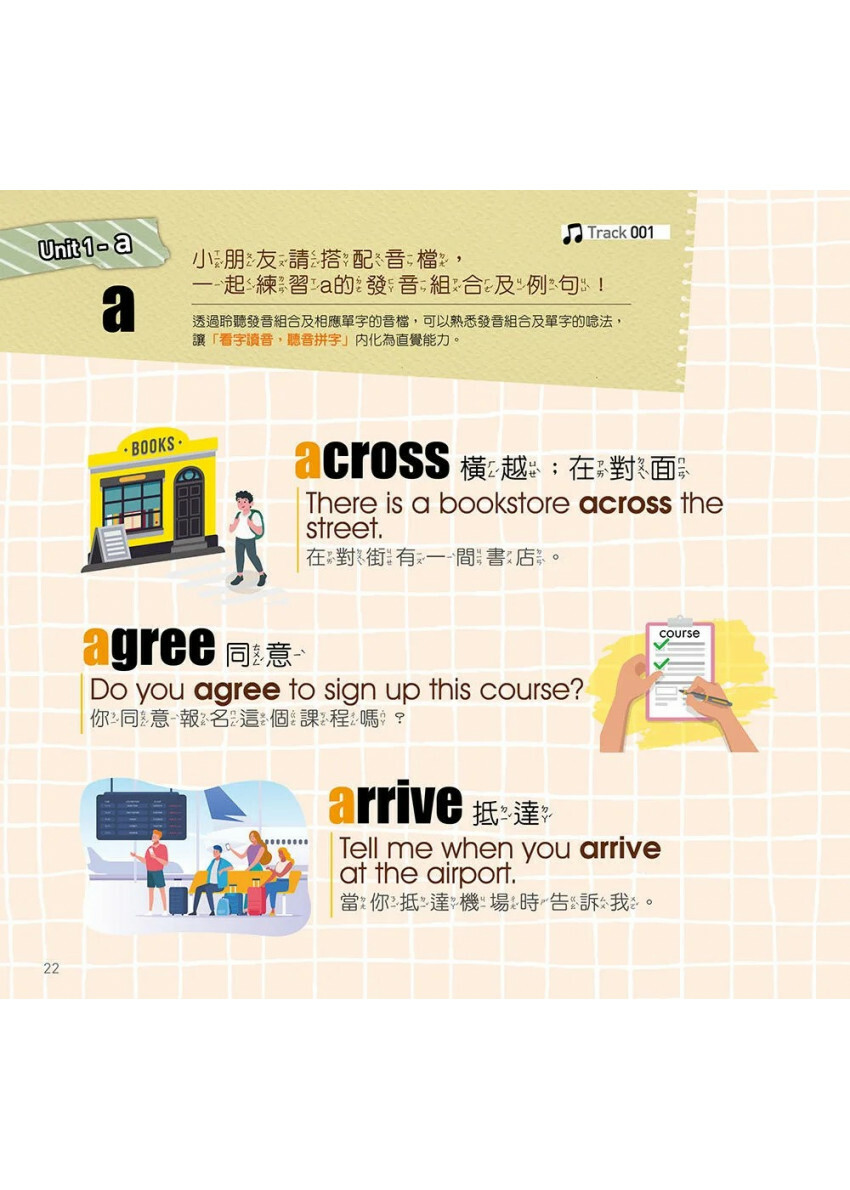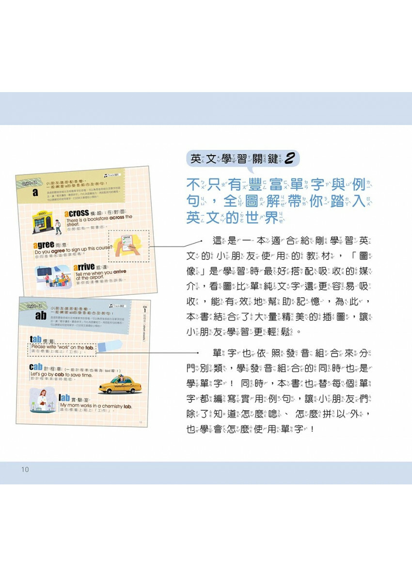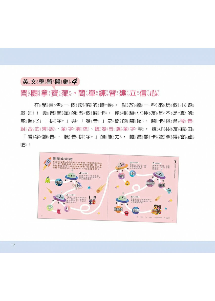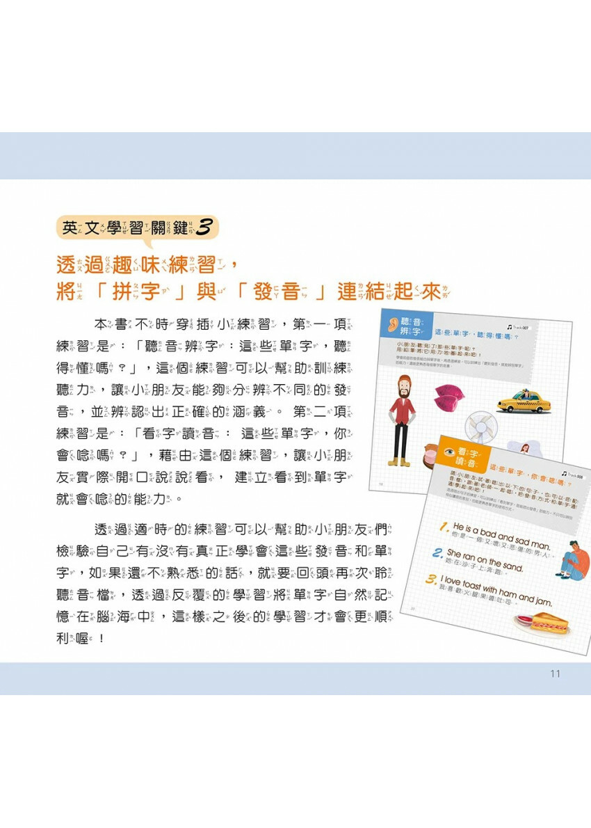 看圖比單純文字還更容易吸收,因此本書每個單字都有搭配精美插圖,能有效地幫助記憶。除了大量精美插圖外,還不時穿插趣味練習,幫助小朋友建立「看字讀音」、「聽音拼字」的能力。
